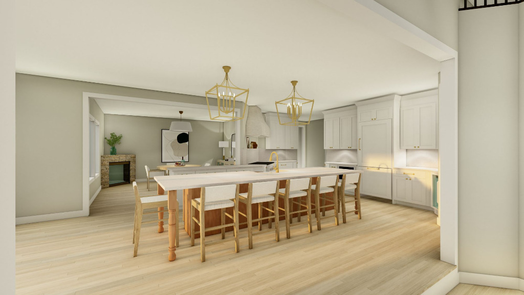 This rendering showcases a complete refresh of the heart of the home: the kitchen, great room, and foyer. With a bright, open layout and carefully selected materials, the design brings warmth, flow, and a modern touch to every space. You’ll see how updated lighting, cabinetry, and finishes can completely transform your home’s first impression. Whether you’re thinking of small updates or a full makeover, this rendering offers real inspiration for a cohesive and inviting look. Step inside and see what your home could become.